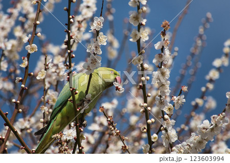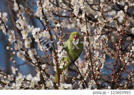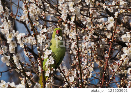 梅の花を食いちぎって蜜を吸うワカケホンセイインコ6