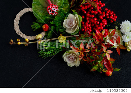 黒い壁に飾られたグリーンスワッグと蝋梅