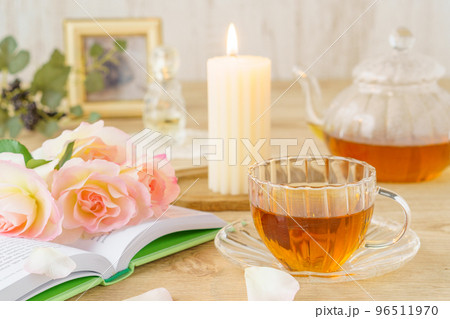 Cozy composition with a teapot, a cup and a book on a blurred background.
