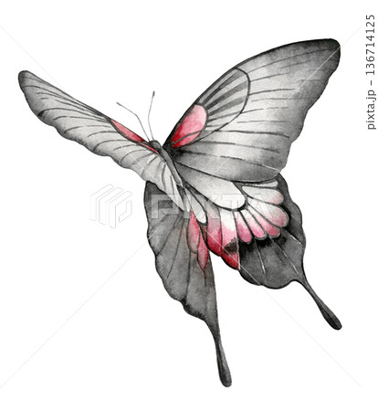 Watercolor Thai swallowtail butterfly with gray wings and pink accents. Tropical insect illustration for nursery decor, poster, wallpaper, textile print, packaging or educational materials.