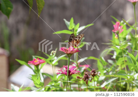 Macro Photo of Peacock Pansy Butterfly in pink flower