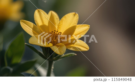 Exquisite close-up of a vibrant yellow flower, petals unfurled to reveal intricate textures. Verdant leaf curves gracefully alongside, complementing the golden warmth. Soft dreamy backdrop highlights