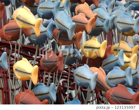 Hanging goldfish fleeing in the same direction