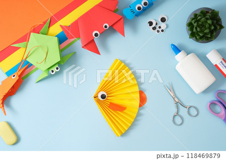 Multicolored origami paper crafts fish, shrimp, crab, turtle. Items for paper art colored sheets, glue, scissors on a blue background.