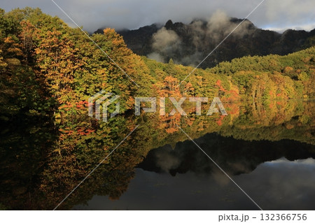 晩秋、戸隠高原の鏡池、湖面に映った戸隠連峰と紅葉