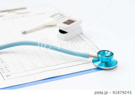 聴診器と体温計とパルスオキシメーターで検査値を記録