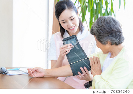 シニア女性と介護士 血圧を測る介護士