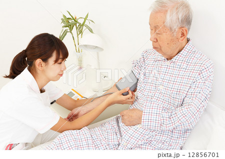 血圧を測る看護師と老人