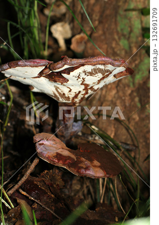 日本の森の中で野生のマンネンタケ属キノコが生える枯木(自然下菌キノコ類マクロ撮影)