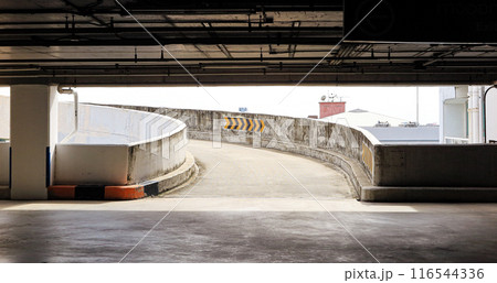 Yellow markings with blurred modern cars parked inside closed underground parking lot.