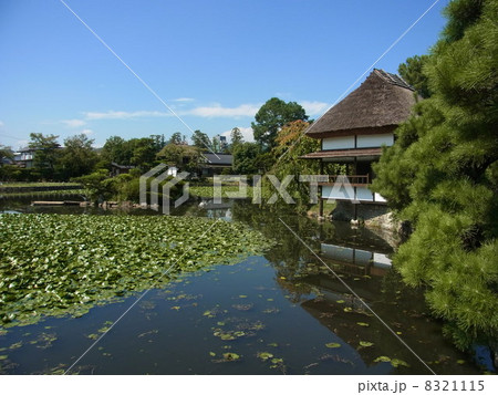 真っ青の空の下池一面に咲き誇る睡蓮と茅葺き屋根の建物「津山衆楽園」