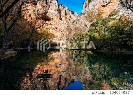 Monasterio de Piedra lake reflecting autumn cliffs and trees