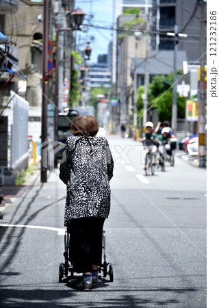日本の横浜都市景観 高齢化社会(キャリーカーを杖がわりに歩行する高齢女性)…=横浜市内で
