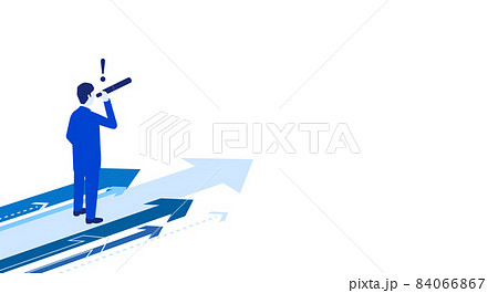 望遠鏡で発見するビジネスマンと矢印のイラスト、ベクター、白バック、コピースペース
