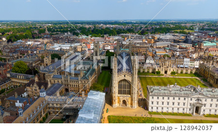 Cambridge University buildings and surrounding urban landscape from above