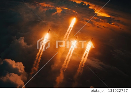 Multiple missiles streaking across a dark evening sky, illuminating the clouds with fiery trails