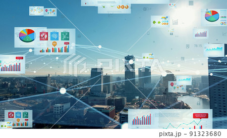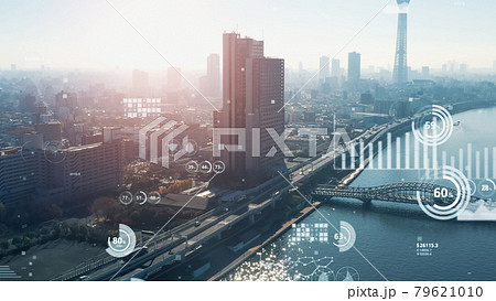 現代都市空撮とデジタルテクノロジーのコンセプト