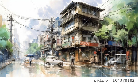 大雨の街角:大雨に見舞われた街の様子の水彩画