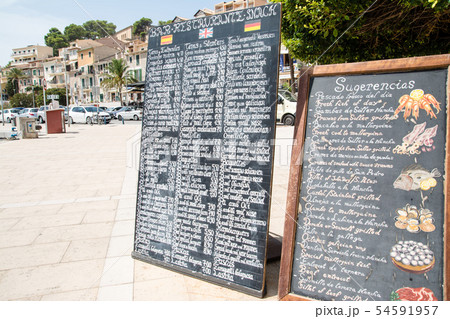 マヨルカ島の港脇にあるシーフードレストランのメニューと街並み