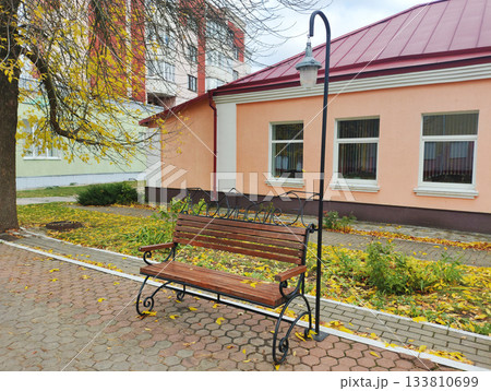 Empty wooden park bench and street lamp on paved walkway, autumn day scene. Yellow leaves cover ground and stone pavement. Buildings with red roof and residential block visible in urban setting.