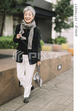 閑静な住宅街に佇むグレイヘアの上品な日本人女性
