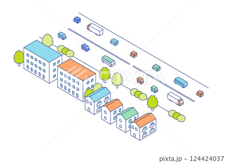 アイソメトリックの街と道路のイラスト。賑やかな通りと道路沿いに立ち並ぶアパートやビルなどの建物。