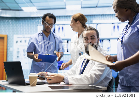 Physician and nurses reviewing medical charts and test results, aiming to deliver the best possible care in a hospital environment. Specialists diverse team consulting healthcare records for control.