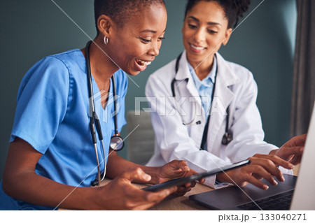 Tablet, black people or doctors planning surgery and in conversation about medical news or tests results in hospital. Teamwork, laptop or African nurses speaking of healthcare report or web research
