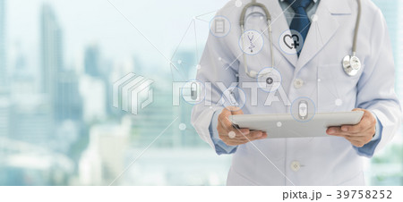 Male doctor is with stethoscope. Professional medical worker in white coat is in the office