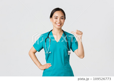 Covid-19, healthcare workers, pandemic concept. Professional confident female asian doctor, nurse in scrubs pointing at herself and smiling, guarantee she knows what do, white background