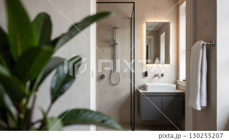 Modern Bathroom Interior with Stylish Shower, Mirror, Sink and Green Plant Accents in Space