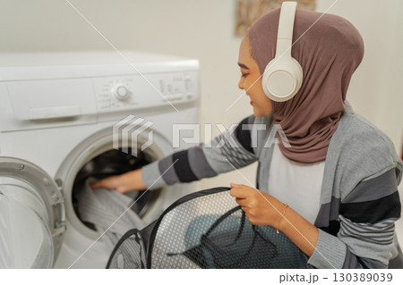 Woman Handling Laundry at Home with Headphones and Relaxing Atmosphere