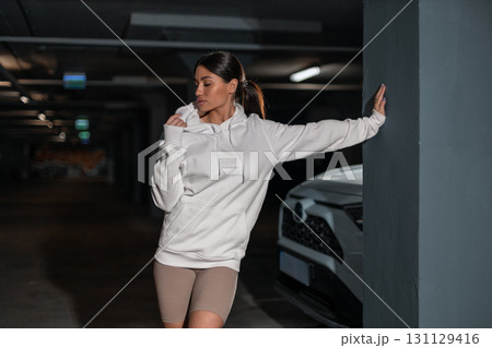 A girl stands confidently in a white hoodie in an underground parking lot with a modern vehicle nearby. Soft lights create a calm atmosphere as she enjoys a quiet moment.