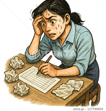 完璧を求めて苦悩する女性の葛藤,間違いを恐れて手が止まる完璧主義の女性,書いては消す…悩みながら進め