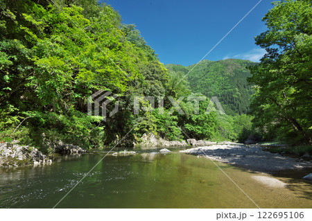 青空を背景に緑深い中国山地の谷間を流れる匹見川の渓流 Ver1