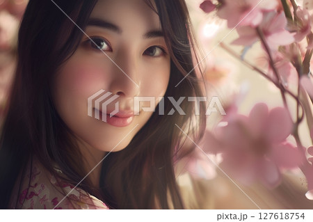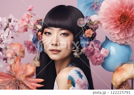 花に囲まれた美肌日本人ヘアメイクスタイル 美人女性像を生成AIで表現(横写真)