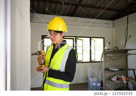 Checking wall alignment using level, surface preparation before installation, marking for renovation, professional interior construction tools.