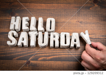 Hello Saturday Concept with Concrete Letters on Wooden Background
