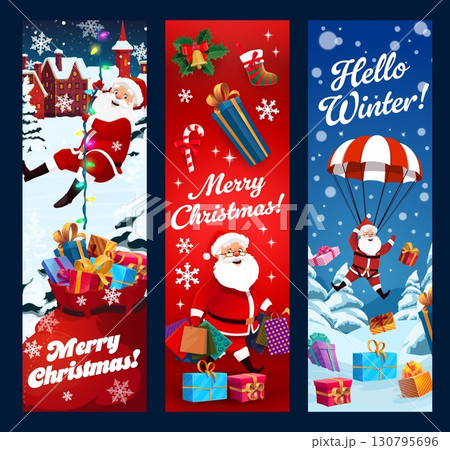 Christmas banners with cheerful Santa characters for winter holidays, cartoon vector. Merry Christmas banners with Santa carrying gifts on parachute or on Christmas lights for New Year greetings