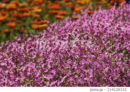 春4月の庭に咲き誇る鮮やかなピンクのシレネの花