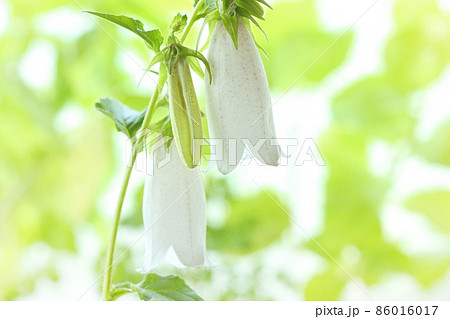 ホタルブクロ 山野草 白花 袋状の下向きの花 明るい背景