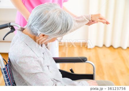 介護イメージ 移乗 介助シーン お話を聞く 老人 風邪 病気