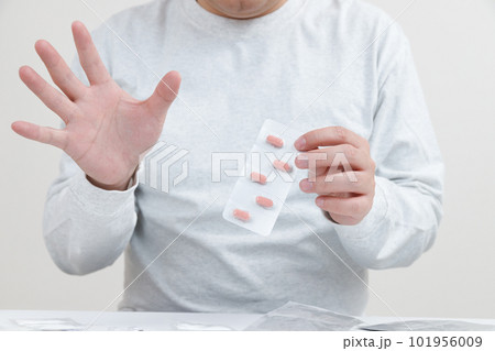 服薬拒否の男性。錠剤を手に持っている