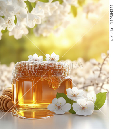 jar honey honeycomb dipper cherry blossoms closeup set