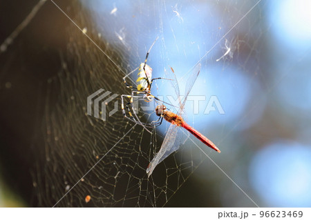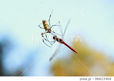 赤とんぼを捕食するジョロウグモ