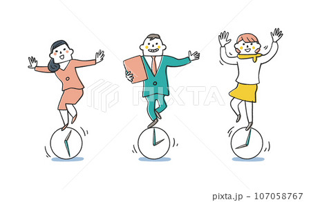 玉転がしのように軽々と時計をコントロールする働く人々 セット イラスト素材