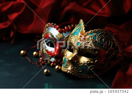 Festive carnival mask for Mardi Gras festival, green velvet curtain purple background. Masquerade