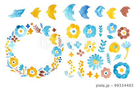 ピンク-水色-黄色の手描きのかわいい水彩風のフレームセット