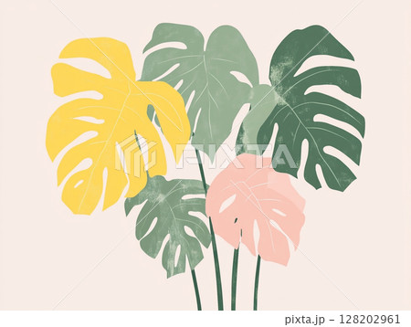 An illustration features three stylized Monstera leaves with dark stems against a light background.