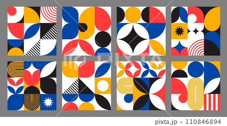 Modern blue, yellow, pink and black abstract geometric bauhaus tile pattern. Dynamic vector ornament with bold lines and vibrant colors, blending form and function for a contemporary graphic design